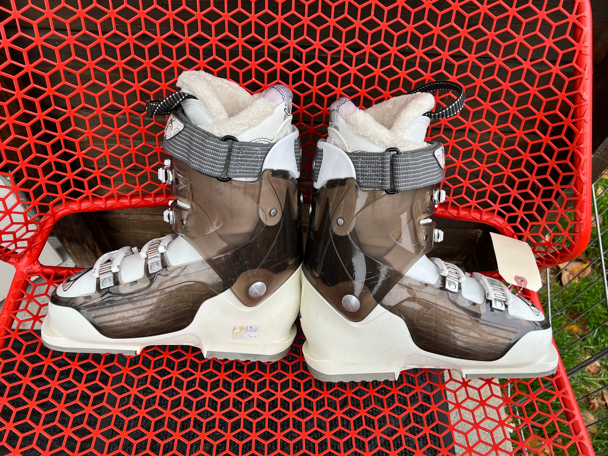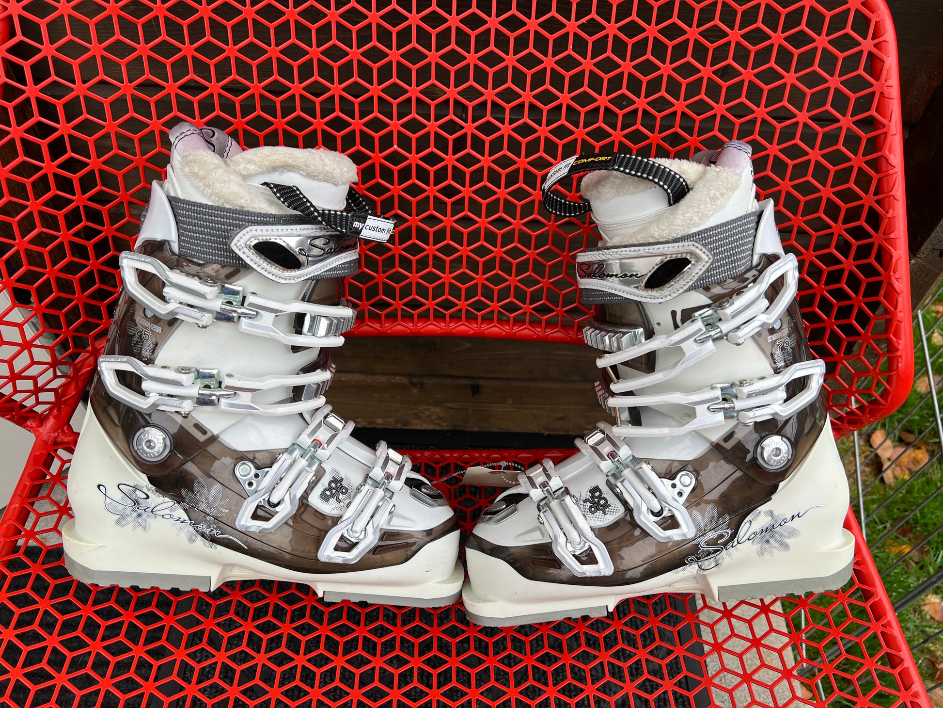 Ski Boots Mondo Size 24.0 Women Size 7 Salomon 287 mm White Bronze Faux Fur Pull Straps and Adjustable Buckles Excellent