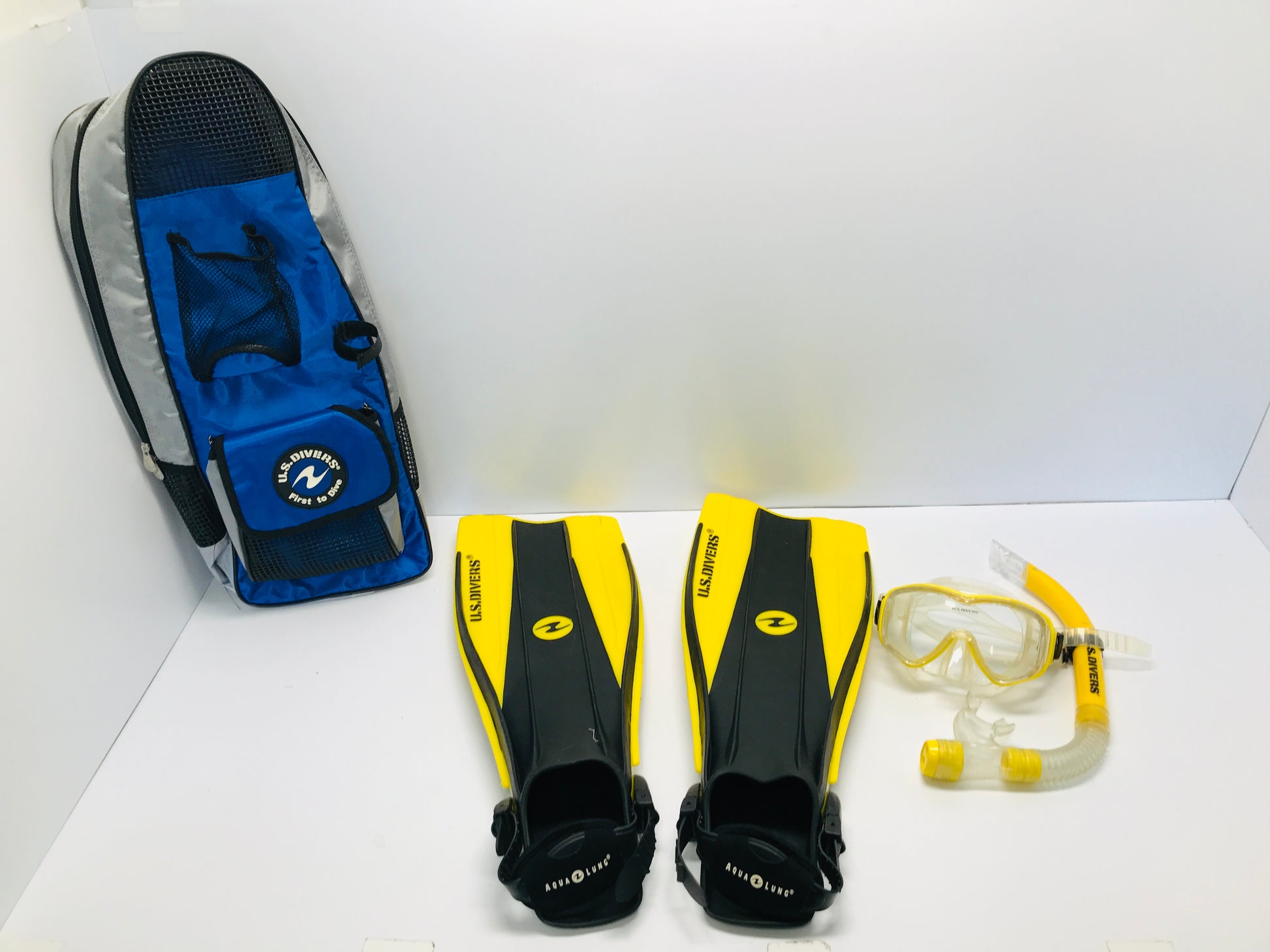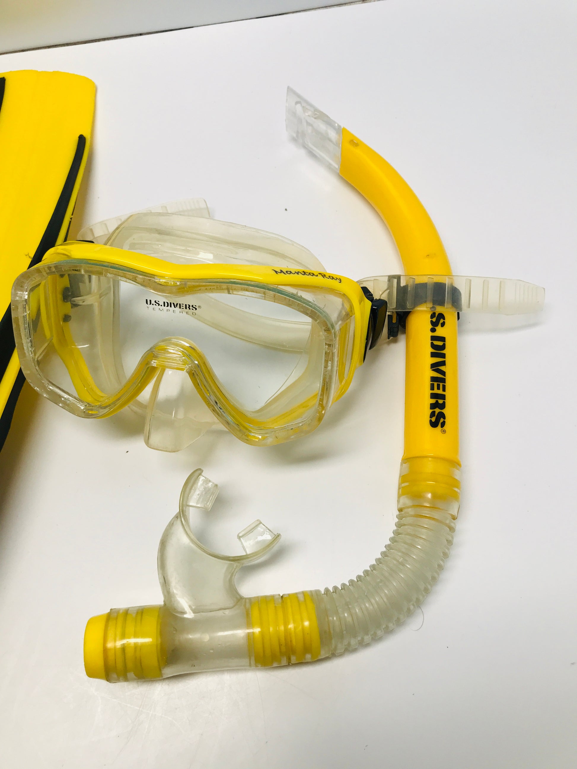 Snorkel Swim Surf Fins Set Men's Size 9-13 Adjustable US Divers Black Yellow Excellent