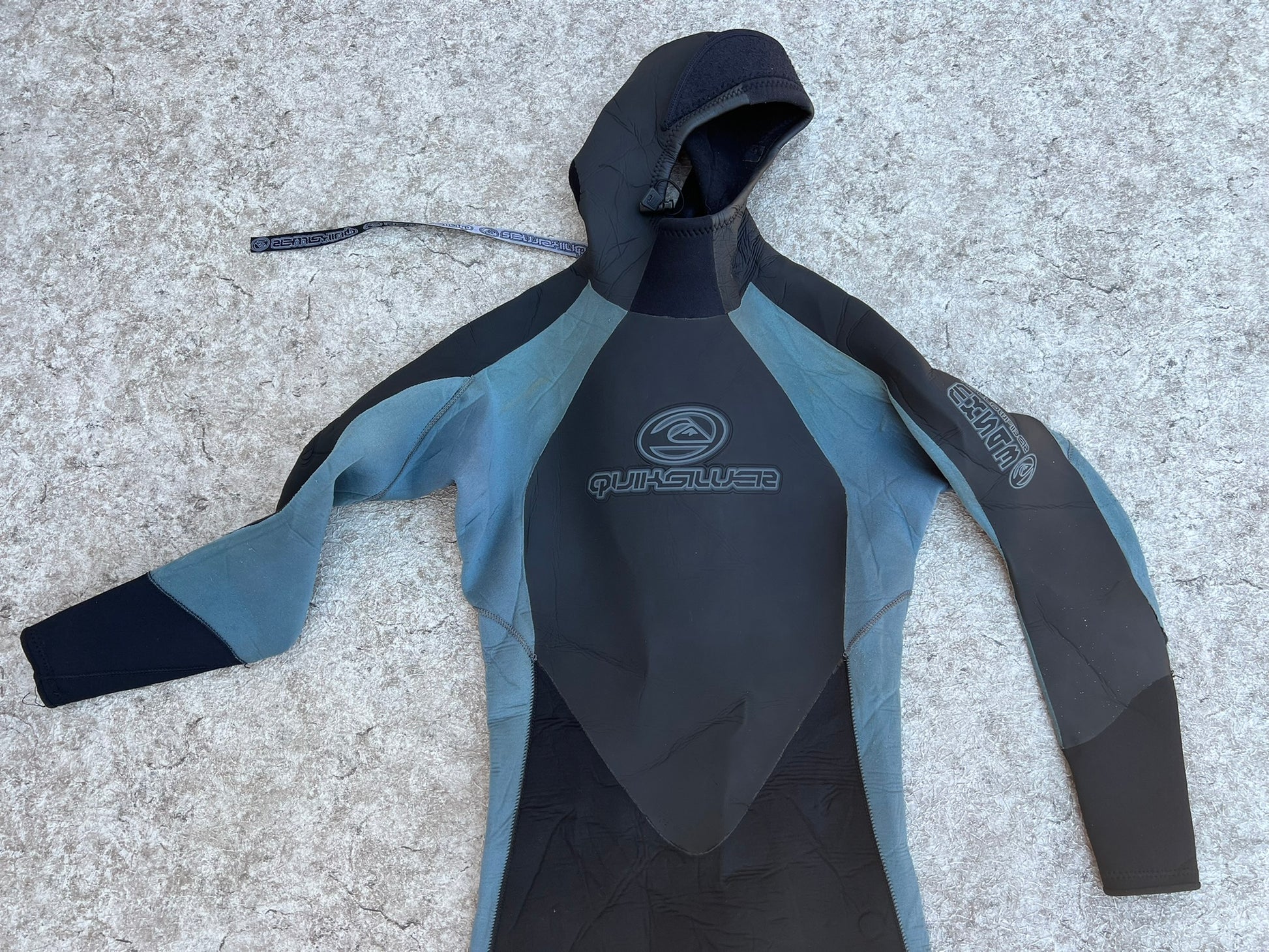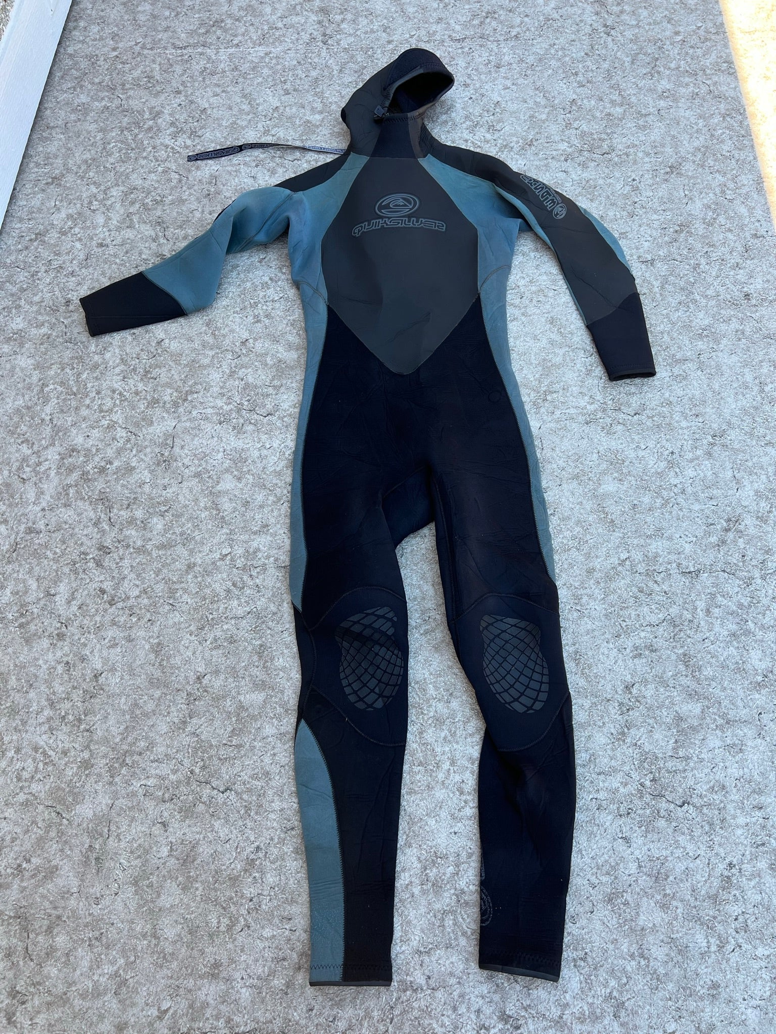 Wetsuit Child Size Youth 12-14 QuickSilver 4-5 mm Black Blue With Hood Some Wear and Pilling Still Works Great For The Surf